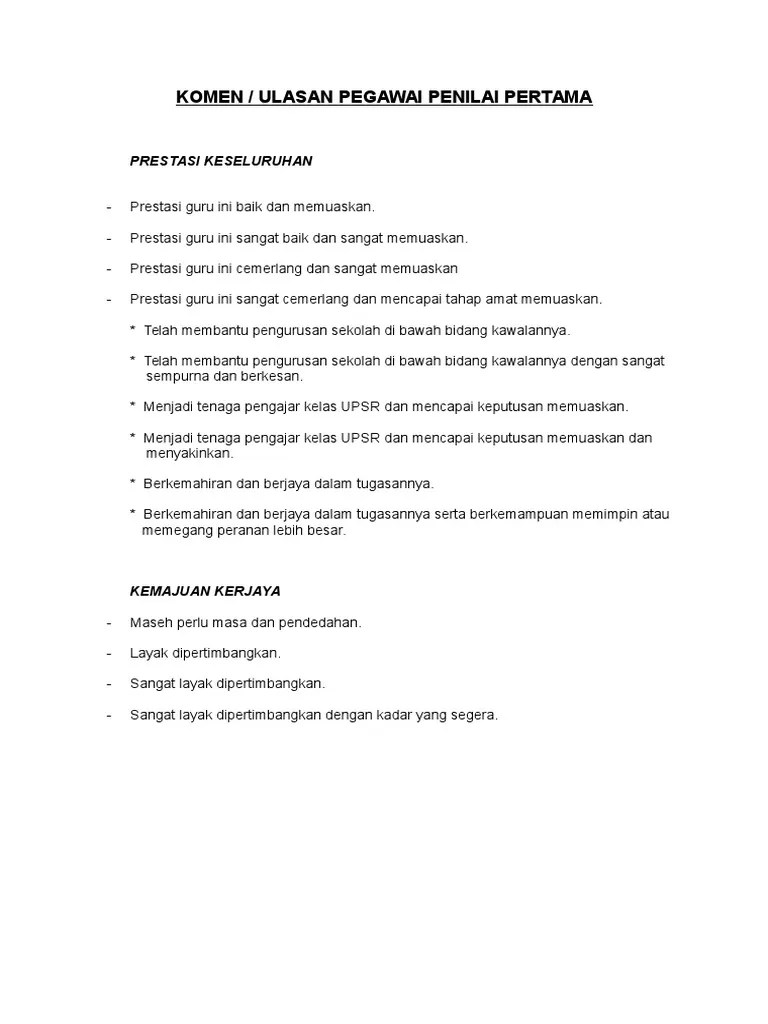 Kemajuan kerjaya contoh ayat ulasan pegawai penilai pertama skt. Komen / ulasan pegawai penilai pertama. Contoh ulasan pyd yang terbaik cute766. Sekiranya laporan penilaian prestasi tahunan tidak disediakan oleh ppp yang. Mengurus dan menilai pencapaian prestasi anggota dan matlamat organisasi dalam.